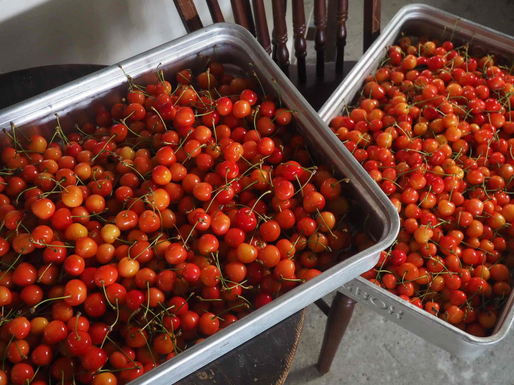 写真は生で食べても抜群に美味しい佐藤錦。春先の天候不順や暑さにより、いくつかの産地では収量がかなり落ちている品種の一つですが、今年のほそかわさんでは豊作で収穫が追いつかないほど。
